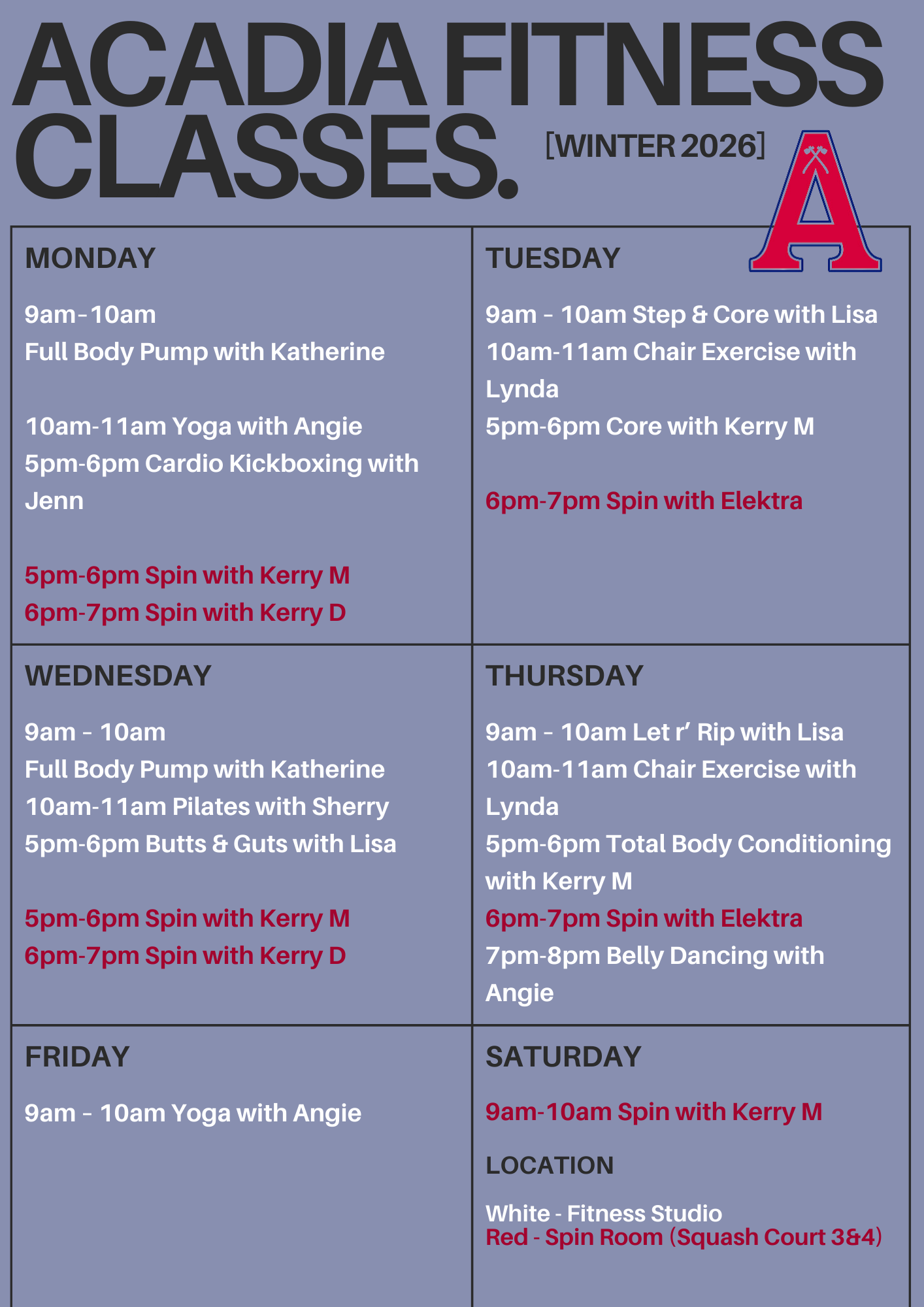 2026 Winter Fitness Class Schedule